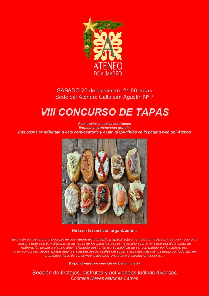 EL Ateneo de Almagro organiza el VIII Concurso de Tapas que se celebrará el sábado, 20 de diciembre a las 21:00 h. en la sede, Palacio de los Medrano de Almagro (Calle San Agustín, 7).