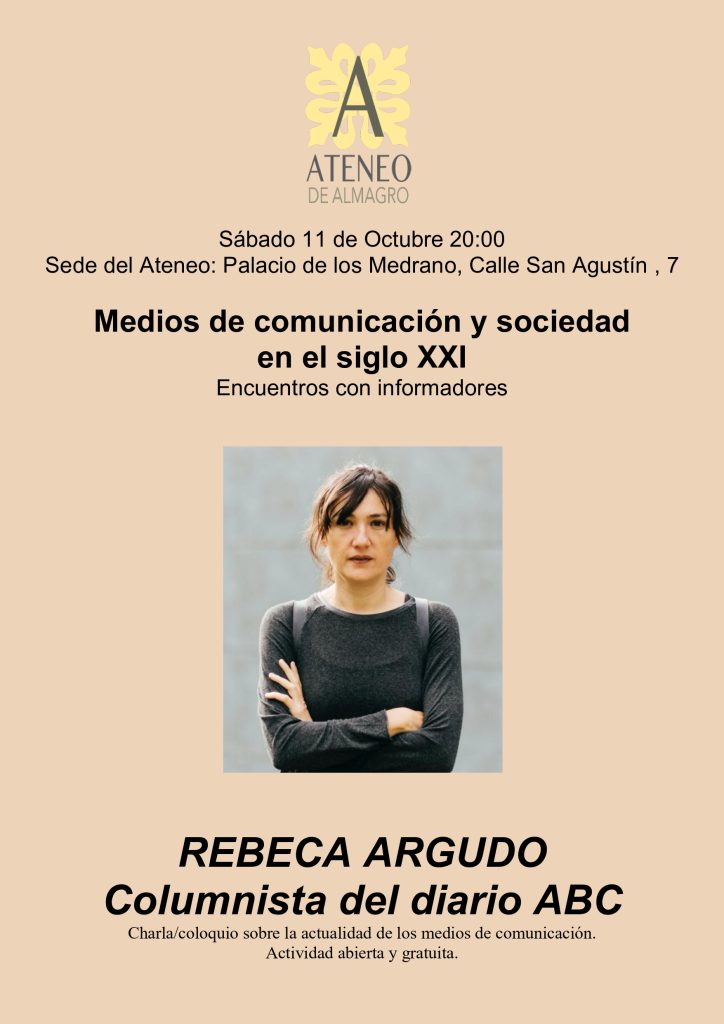 Rebeca Argudo intervino en el Ateneo de Almagro el sábado 11 de octubre con la conferencia titulada «Medios de comunicación y sociedad en el S. XXI», celebrada en el Palacio de los Medrano a las 20:00 h[1][4][9]. En su presentación, Argudo abordó el papel de los medios desde una perspectiva crítica y humana, mostrando cómo influyen en la sociedad contemporánea y destacando la dimensión ética y social en la comunicación actual[5][7].